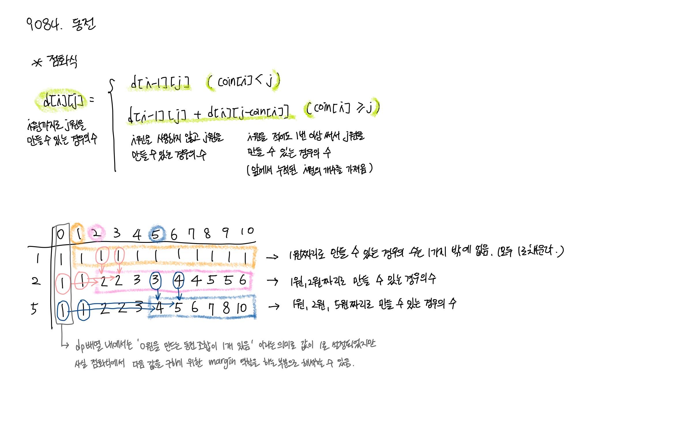 dp[i][j] = d[i-1][j] + d[i][j-coin[i]]; //현재 동전을 안 썼을 때의 개수 + 현재 동전도 함께 고려하며 만들 때의 개수