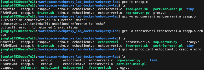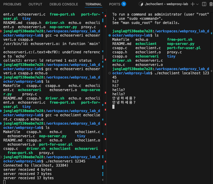 마찬가지로 echoclient 실행 파일을 만들 때 링크가 필요한 .o파일을 모두 명시해준다.