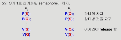 p0, p1이 semaphore 변수가 각각 1인 S, Q라는 자원을 하나씩 차지했다고 하자.
