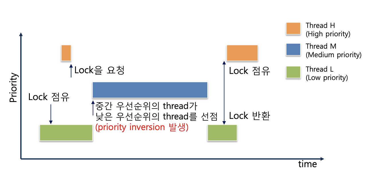 → 이 부분은 우선순위 스케줄링에서 중요하다. lock을 차지하기 위해 기다리는 스레드들 중 우선순위가 가장 높은 스레드를 먼저 깨우지 않으면, 높은 우선순위를 가진 스레드가 lock을 얻지 못하고 block된 채로 대기하게 되기 때문에 우선순위를 무시(priority inversion)하게 된다!