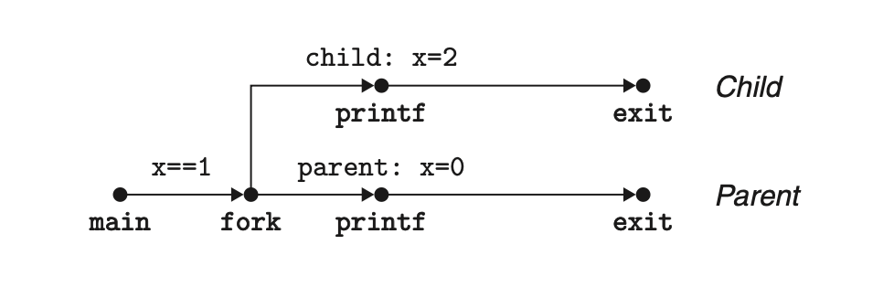 - 현재 프로세스 실행 흐름과 완전히 동일한 자식 프로세스 하나가 생성되고, 가상 주소 공간도 전체가 똑같이 복사된다.