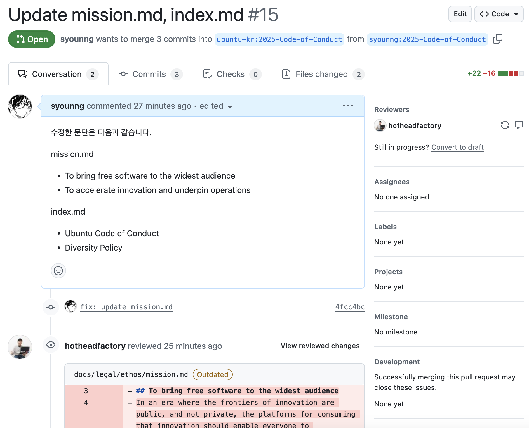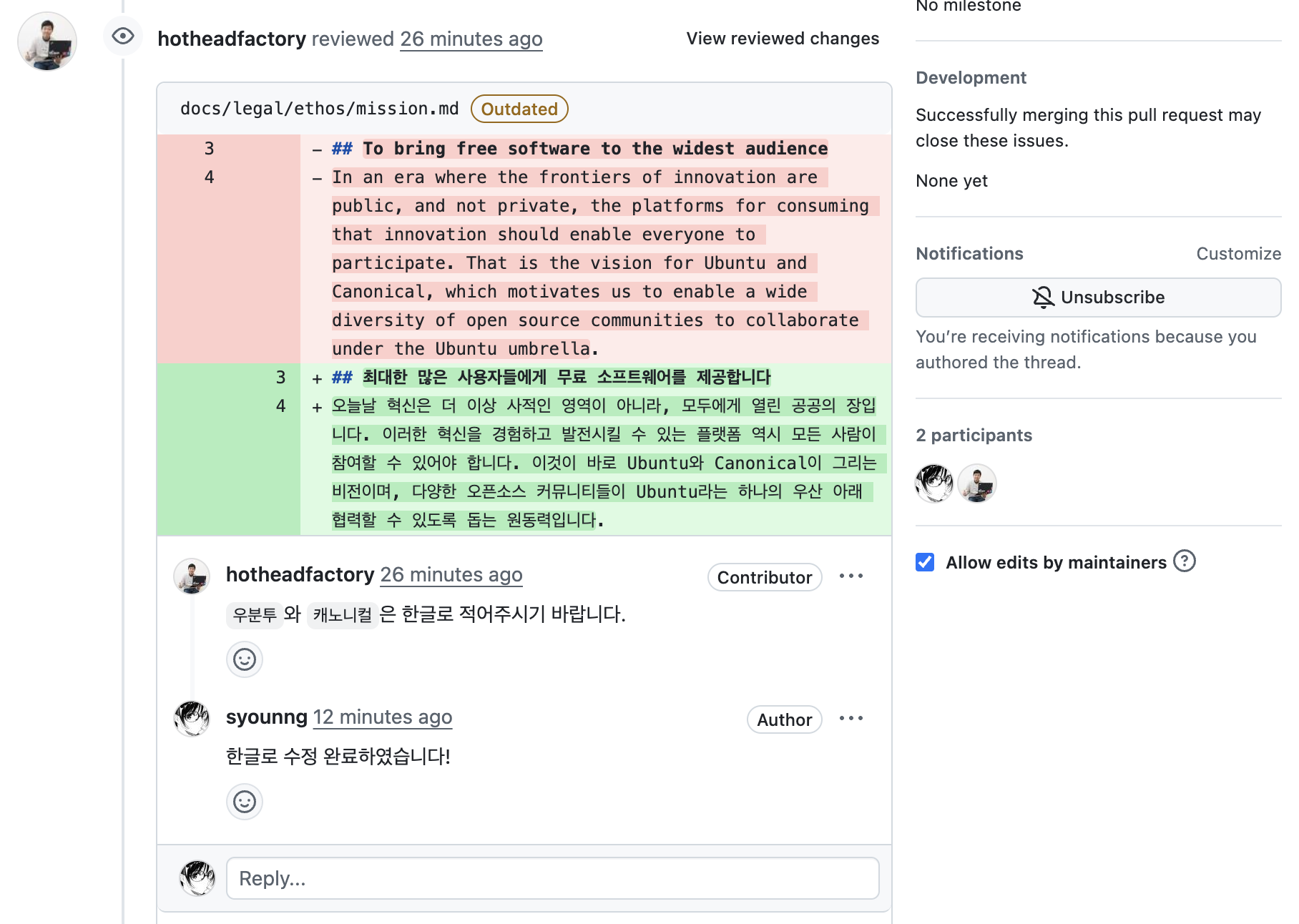 중간에 Ubuntu, Cannonical이라는 용어도 한국어로 번역해야 한다고 알려주셔서 다시 수정한 후 PR을 날렸다.