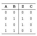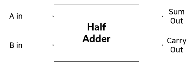 반가산기(half-adder)는 1bit짜리 이진수 두 개를 더한 합과 올림수를 구하는 가산기이다. 두 비트를 더해서 sum, carry 두 비트를 결과로 출력한다. 아래 표를 보면 반가산기의 sum, carry의 출력이 단순히 불 함수 두 개를 구현한 것과 동일하다는 것을 알 수 있다. 반가산기의 목적은 올림수를 구하는 것이다.